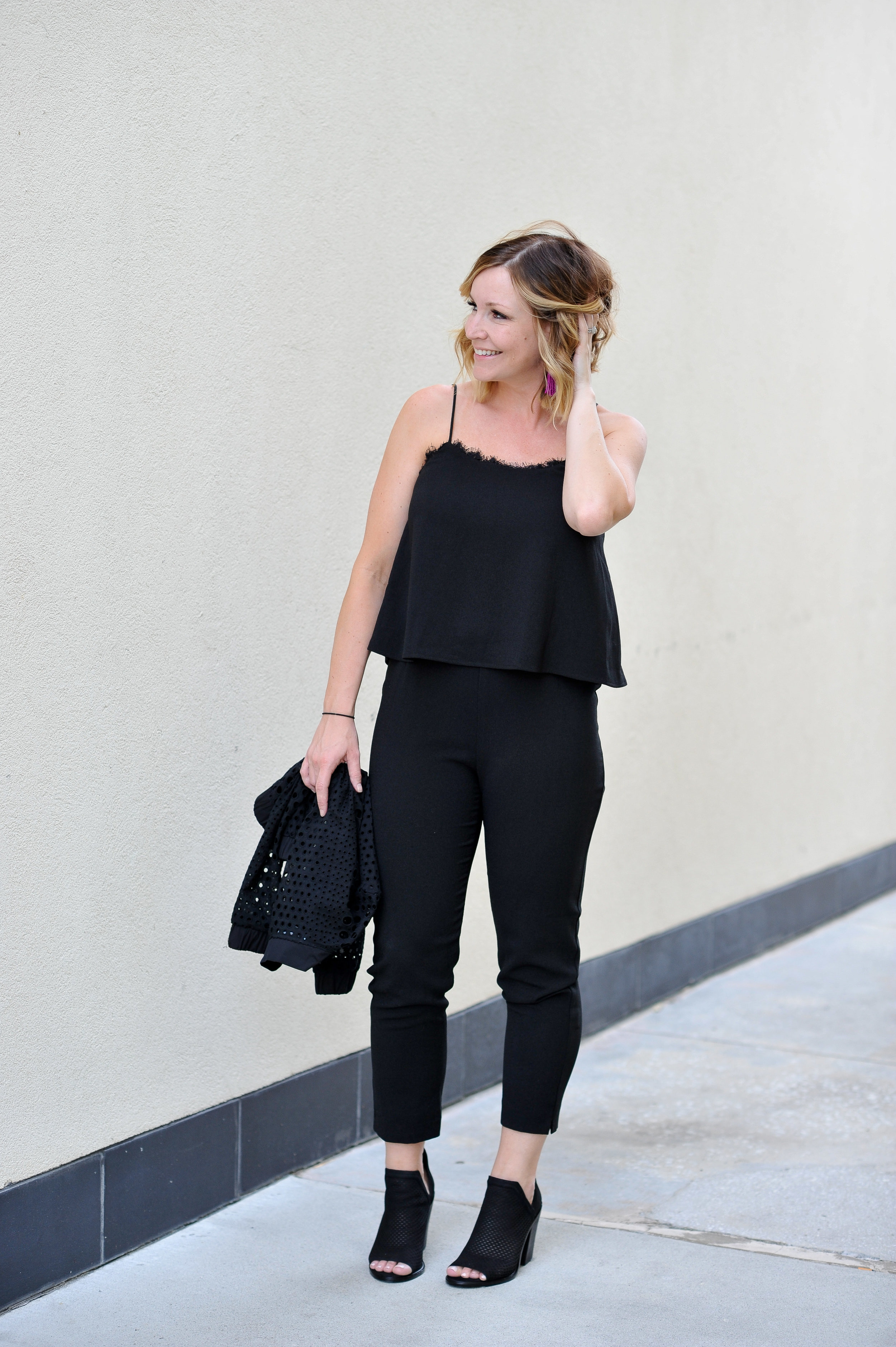 charles henry jumpsuit | vince camuto booties | baublebar earrings | anthropologie bomber | rebecca minkoff backpack